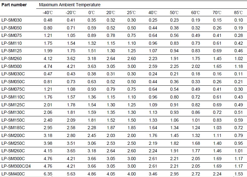 环境温度电流锐减表: